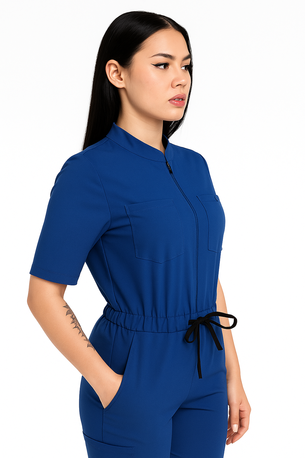 Glam Scrubwear’s GlamSuit is our beautiful scrub jumpsuit. It features an adjustable zipper to style your jumpsuit how you like. It has an elastic waistband with a contrasting drawstring that allows for a flattering fit. It features 2 back pockets with the glam logo located on the back right pocket and a chest pocket with a badge hook.