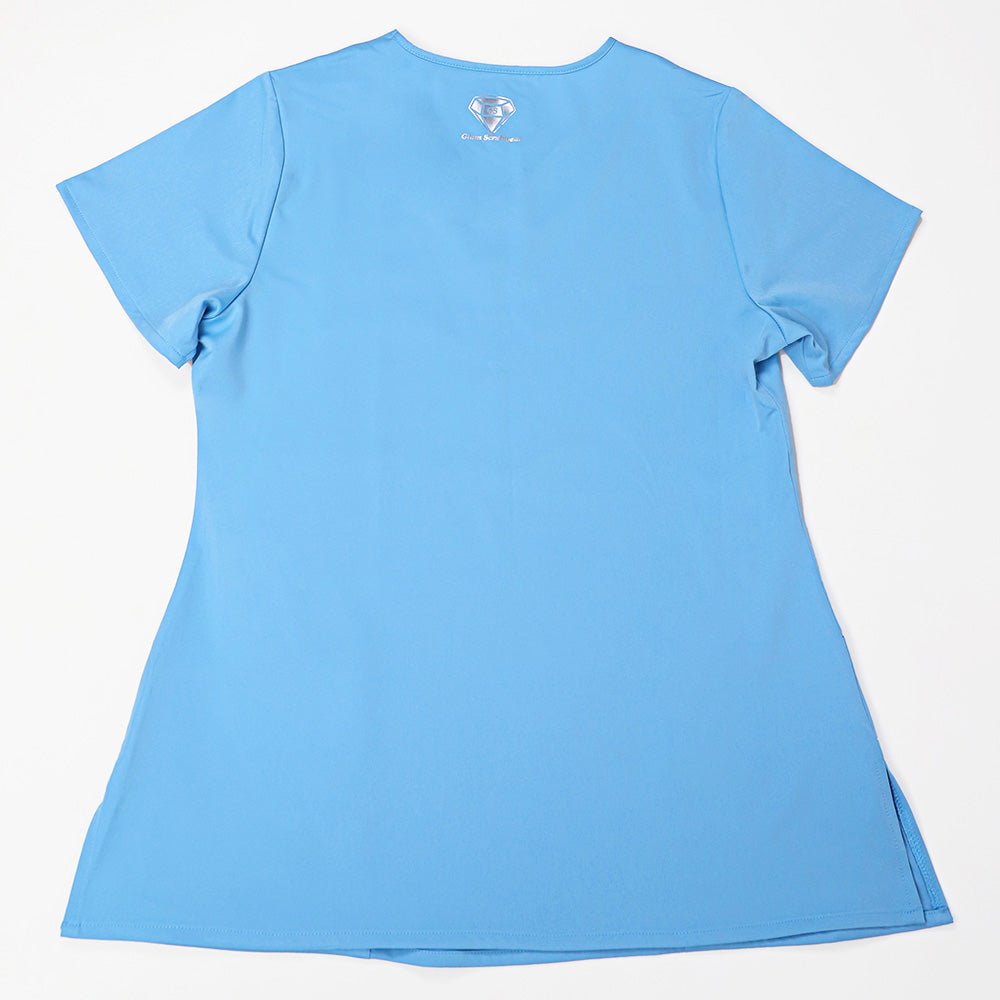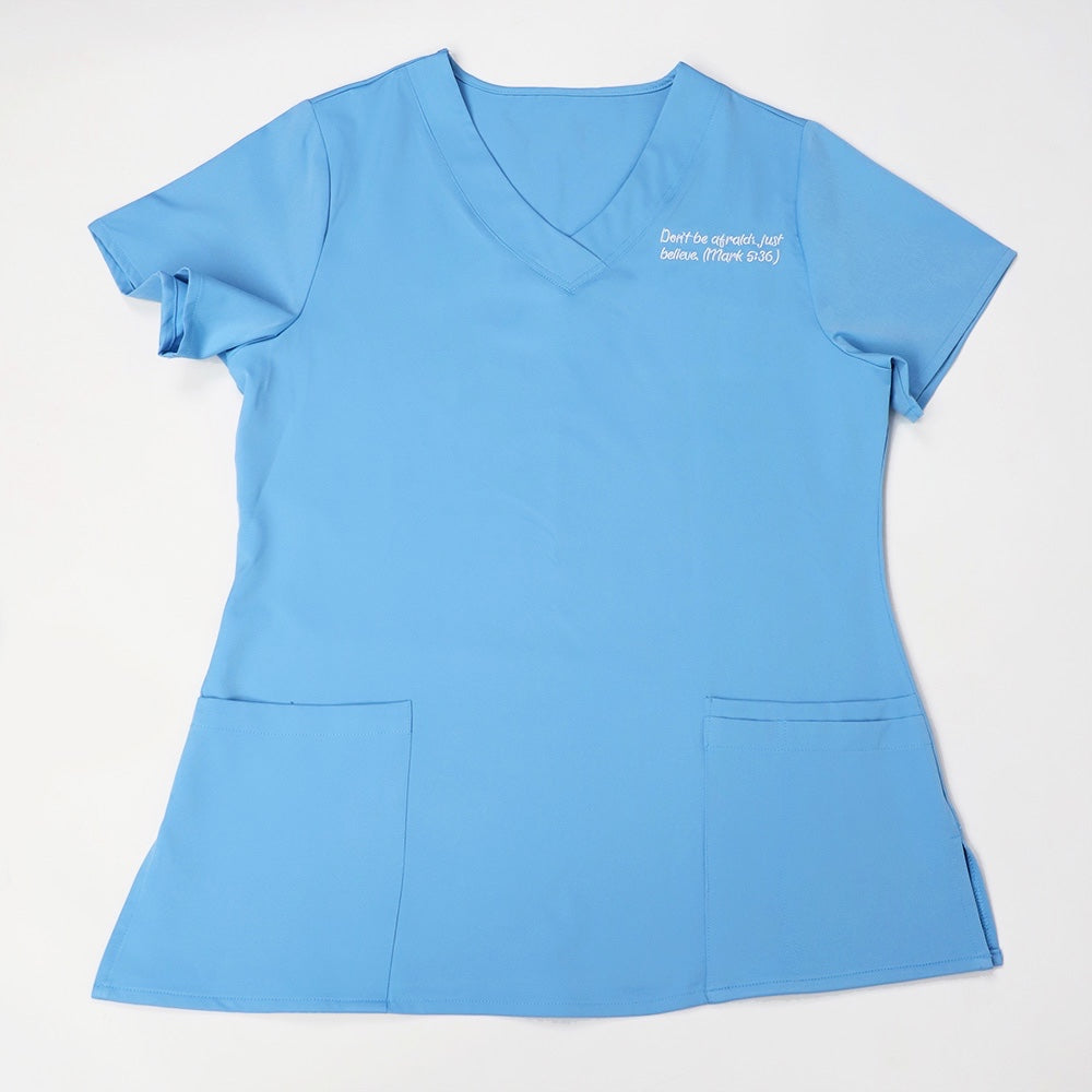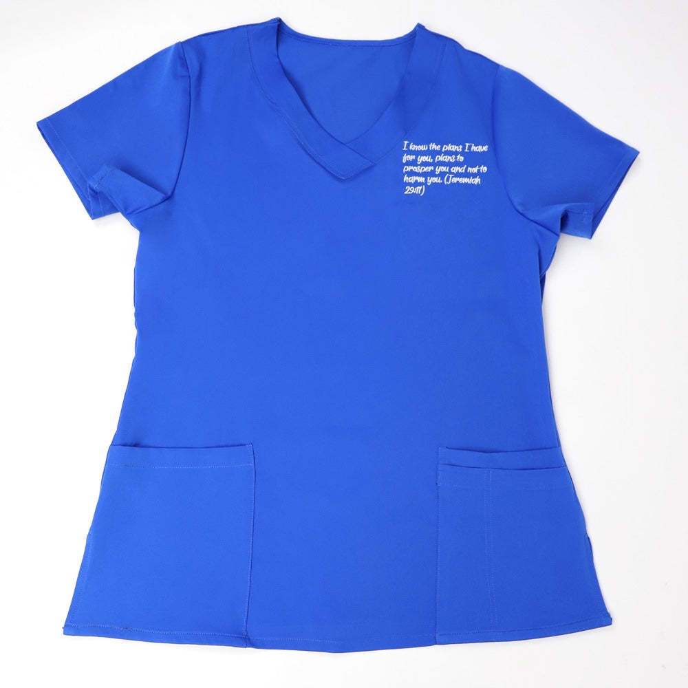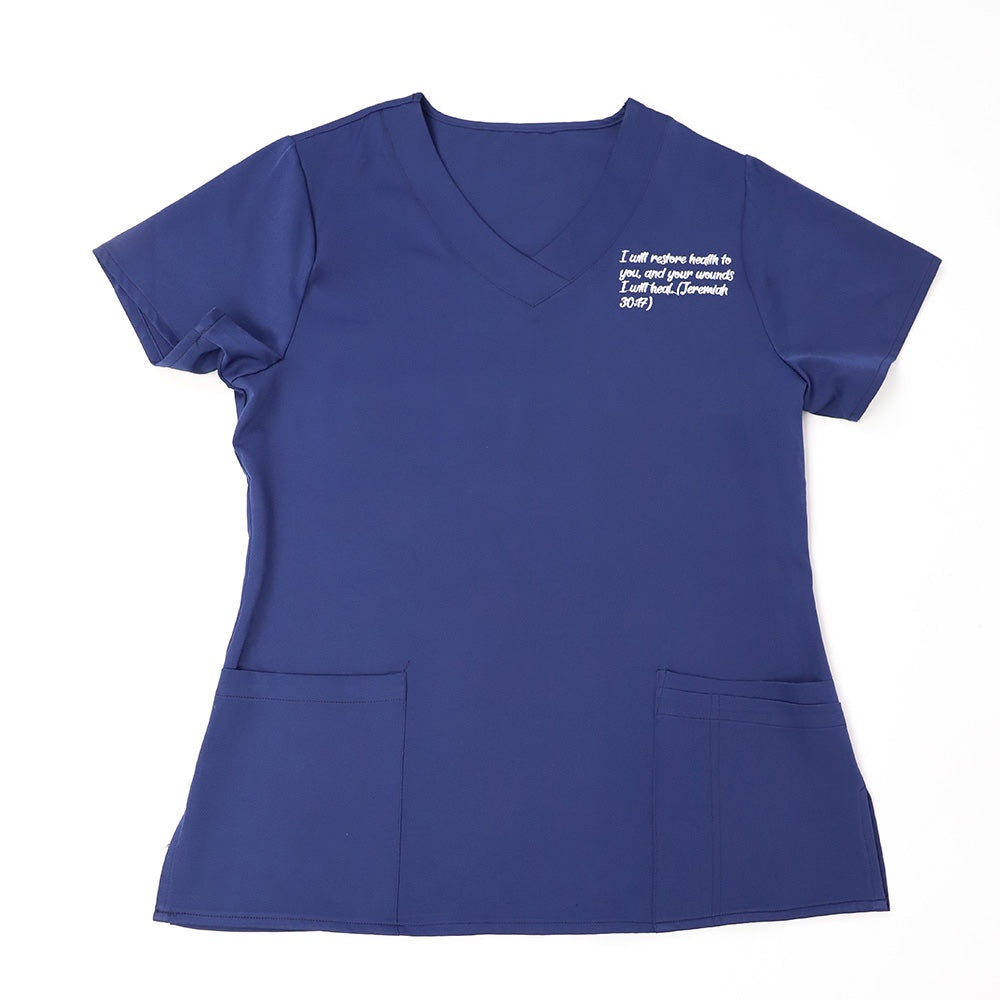 Our "Heavenly" Angel Top- features front and back princess seams with left and right pockets. It features a wide V-neckline. It also features a quote at top left chest area. It is made of 74/23/3 poly/rayon/spandex twill. Logo is located on the back at top center. The material is very comfortable, stretchy, and form fitting.