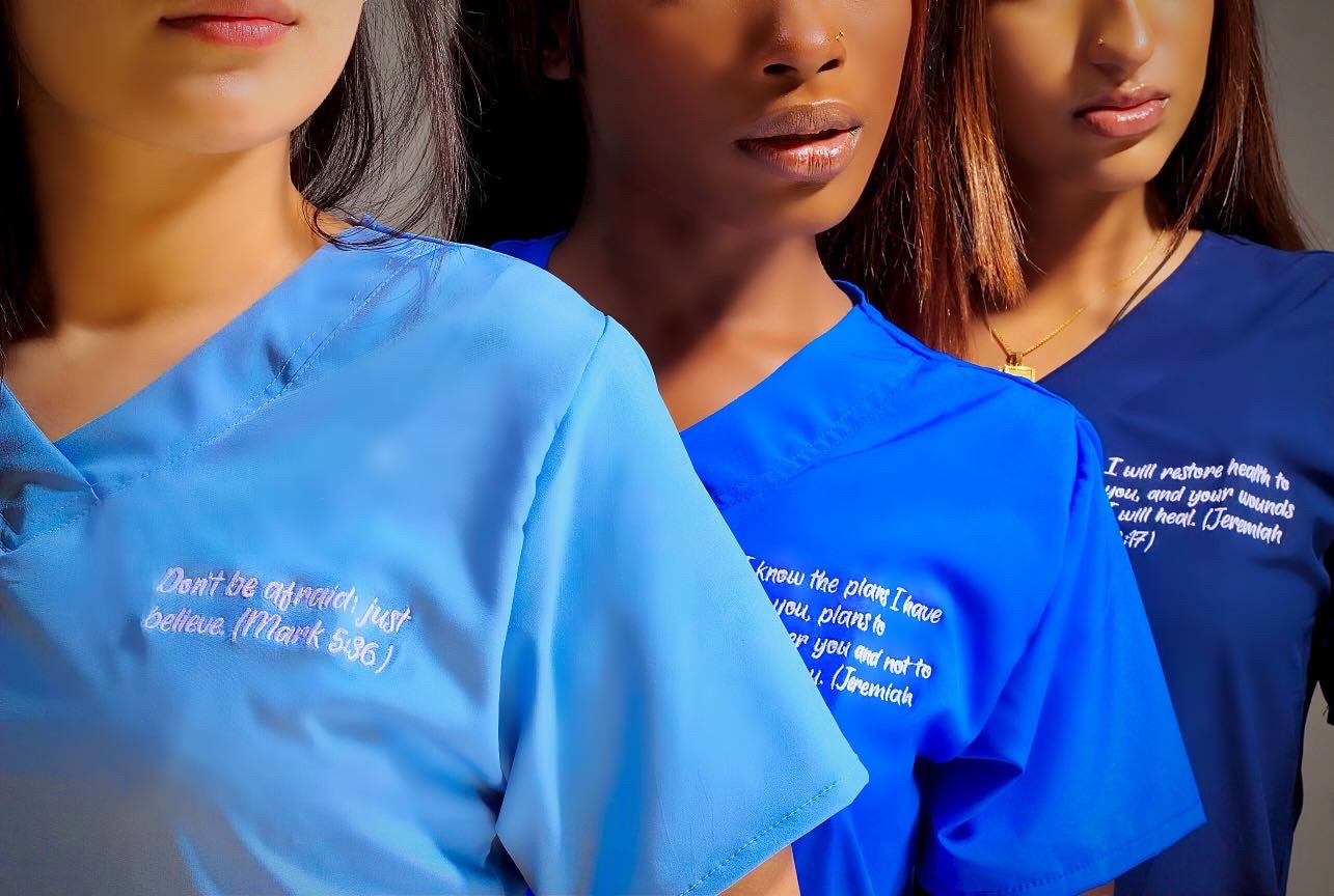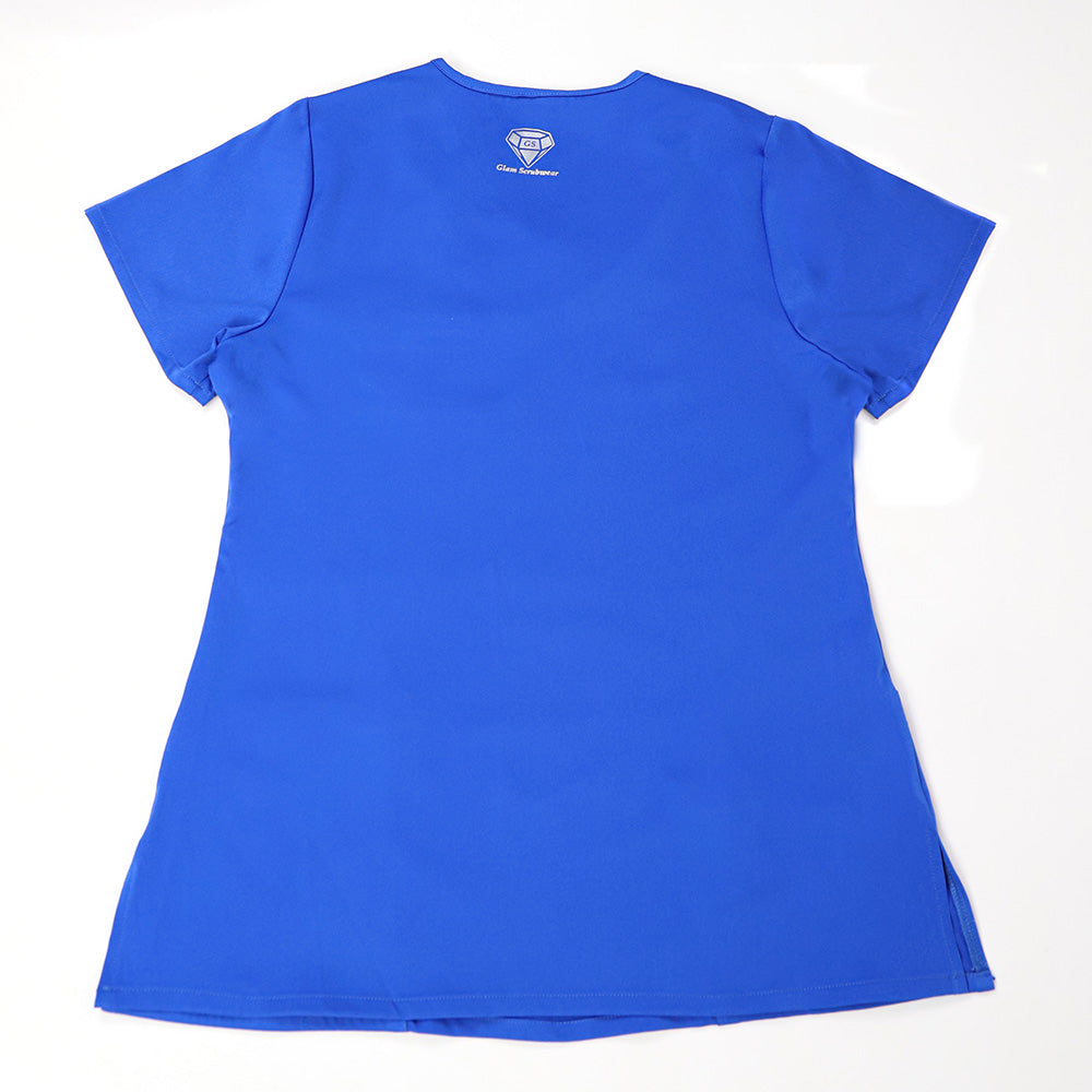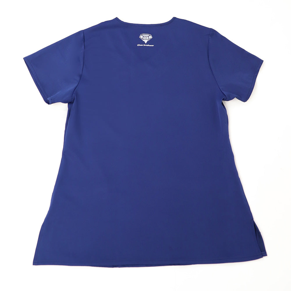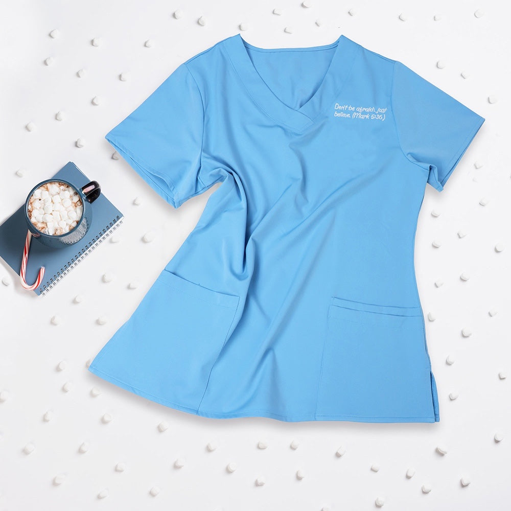 Our "Heavenly" Angel Top- features front and back princess seams with left and right pockets. It features a wide V-neckline. It also features a quote at top left chest area. It is made of 74/23/3 poly/rayon/spandex twill. Logo is located on the back at top center. The material is very comfortable, stretchy, and form fitting.